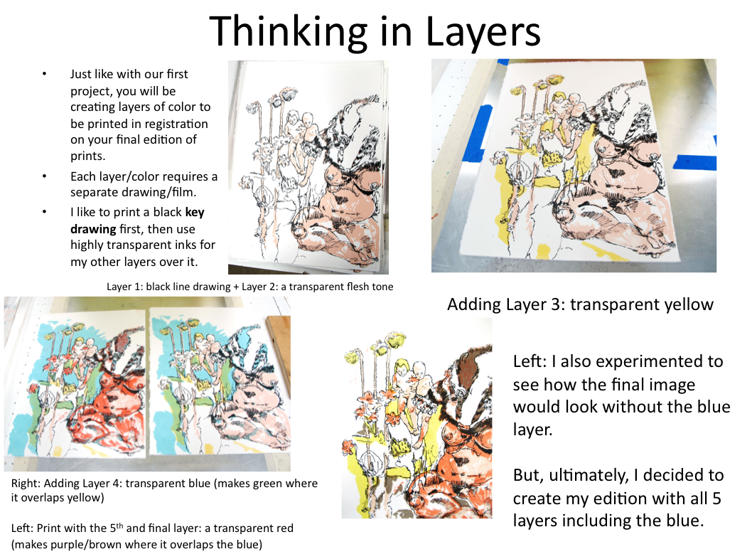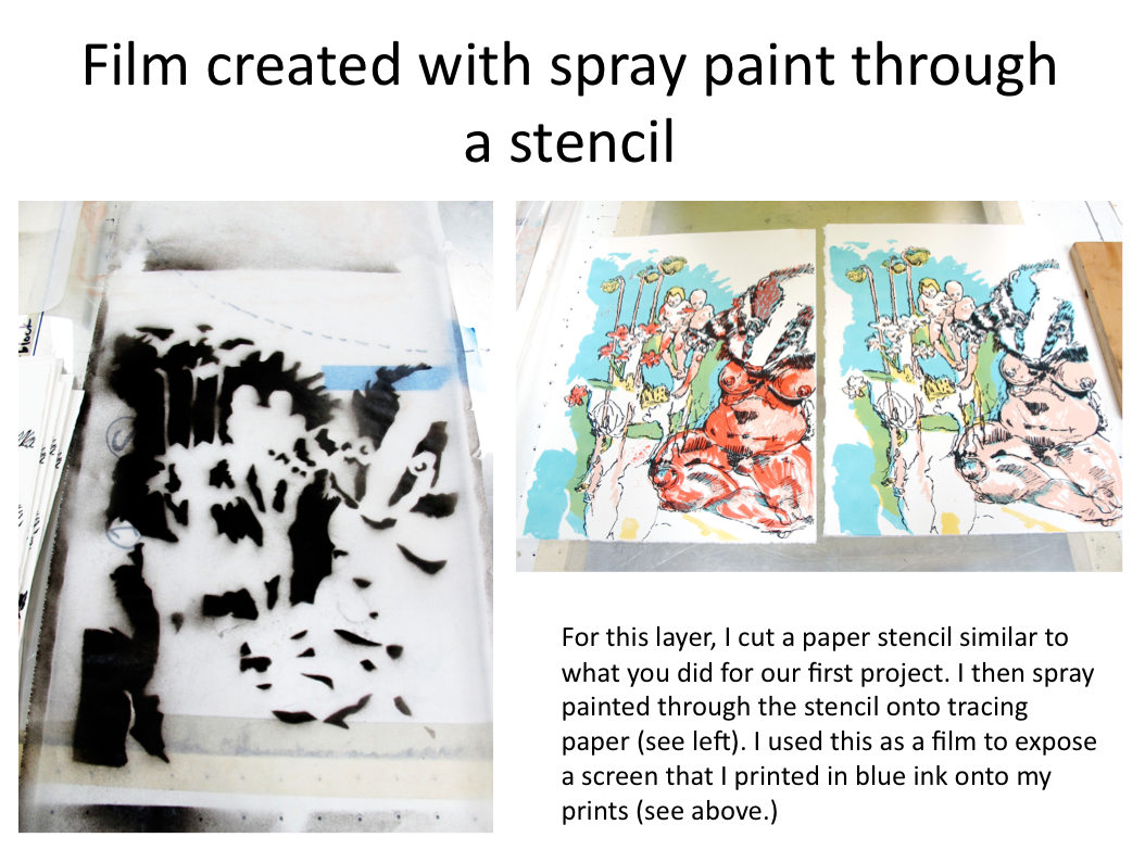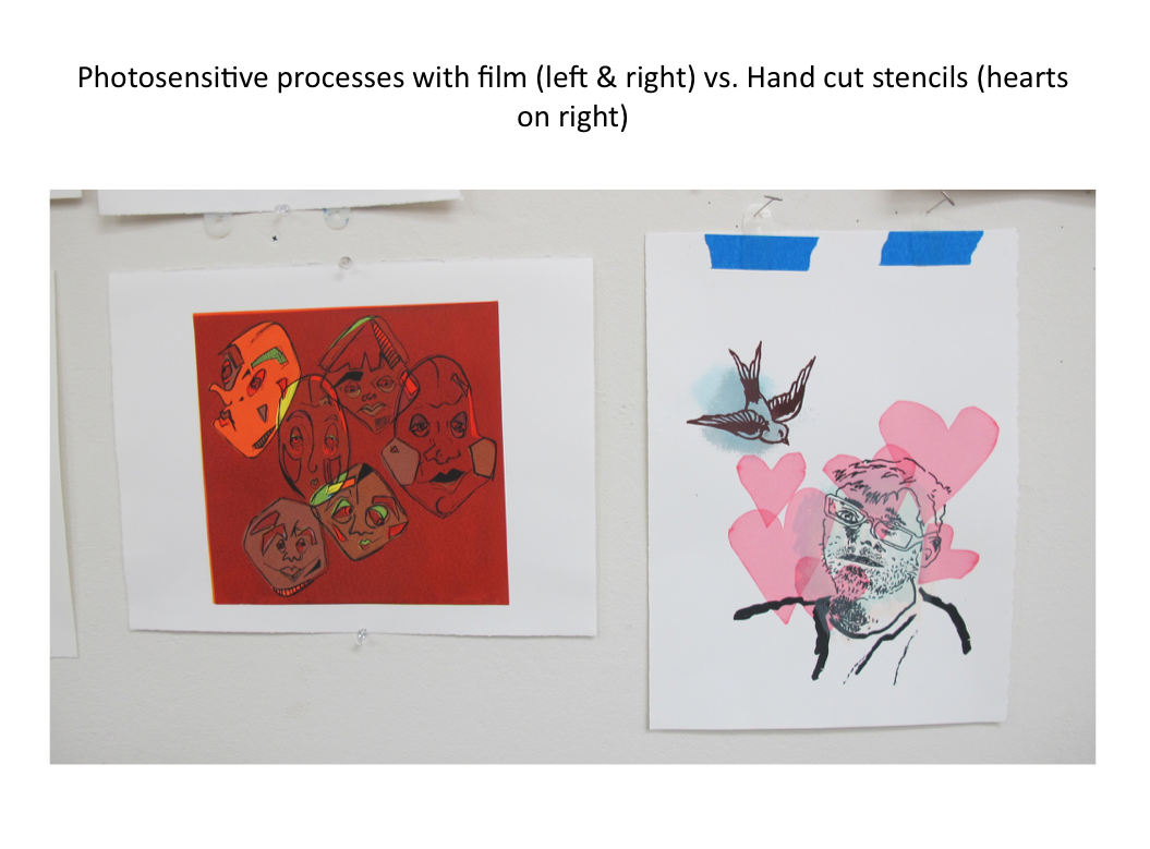 In the next week and a half, we will focus on basic screenprinting techniques utilizing photoemulsion and, if desired, hand cut stencils to create colorful, multi-layer images on paper. Our objectives will be to create a 2- or 3-layered print utilizing lettering and animal imagery including a key layer and at least 2 colors.