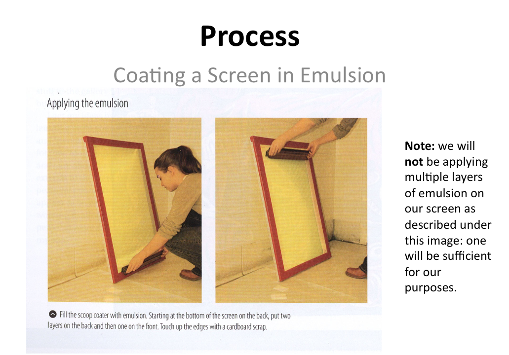 One method of creating a stencil on your screen is through the use of photosensitive emulsion. Screens should be carefully coated with the emulsion in a darkroom, utilizing only safe red light that will not expose the screens to guide your way. A thin, even coating of emulsion should be applied. It need not go right up to the edges of the screen. The proper way to coat a screen will be demonstrated, and you will be assisted with this process, as it may take some time to master.