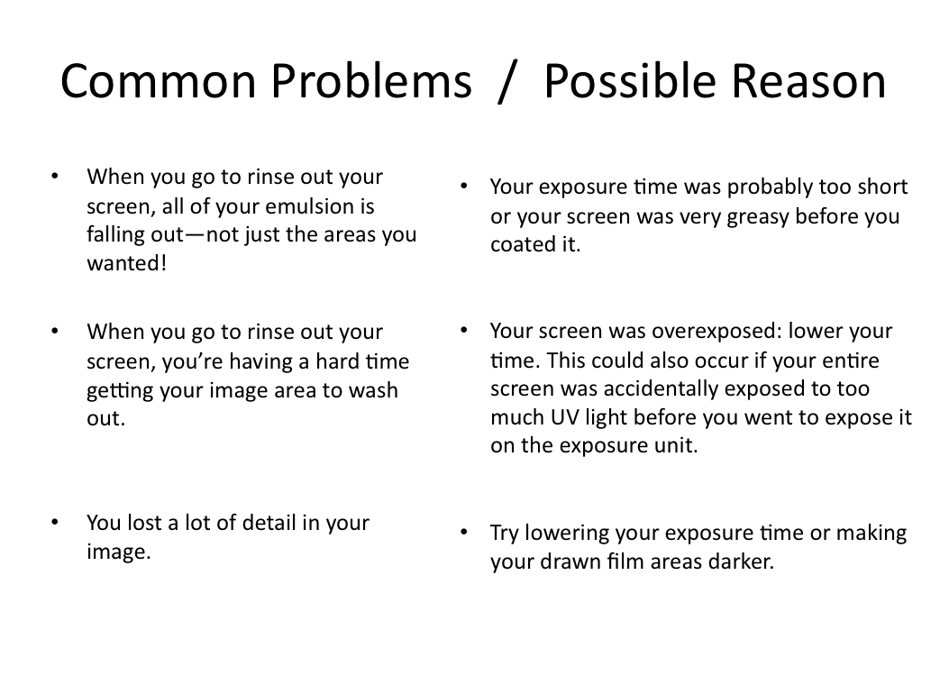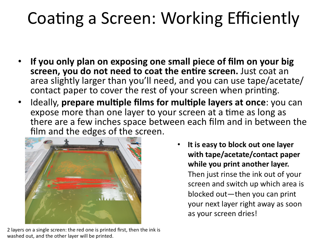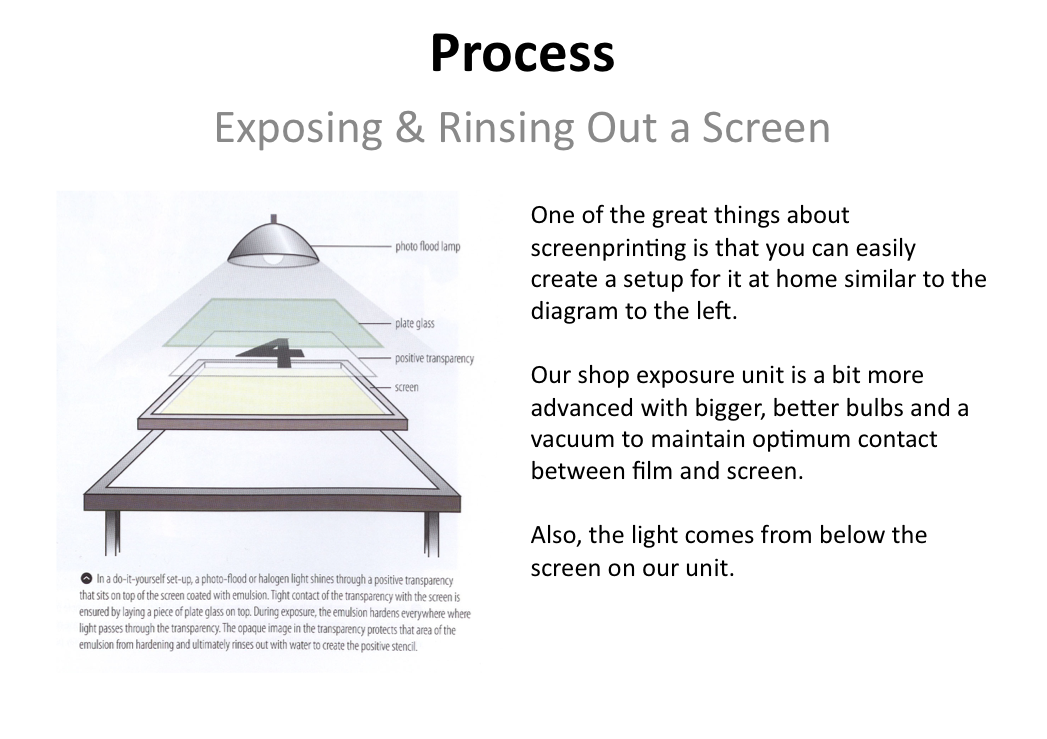 Much of the printing process is better witnessed and practiced rather than trying to learn from reading about it, so please just use these notes as a reminder and not an end-all, be-all guide to how to screenprint.