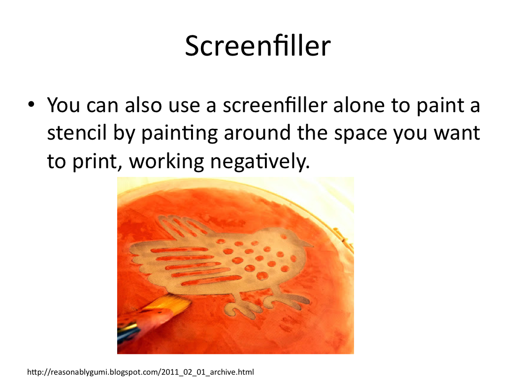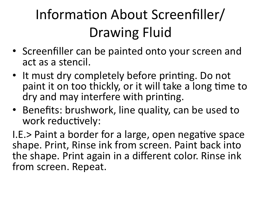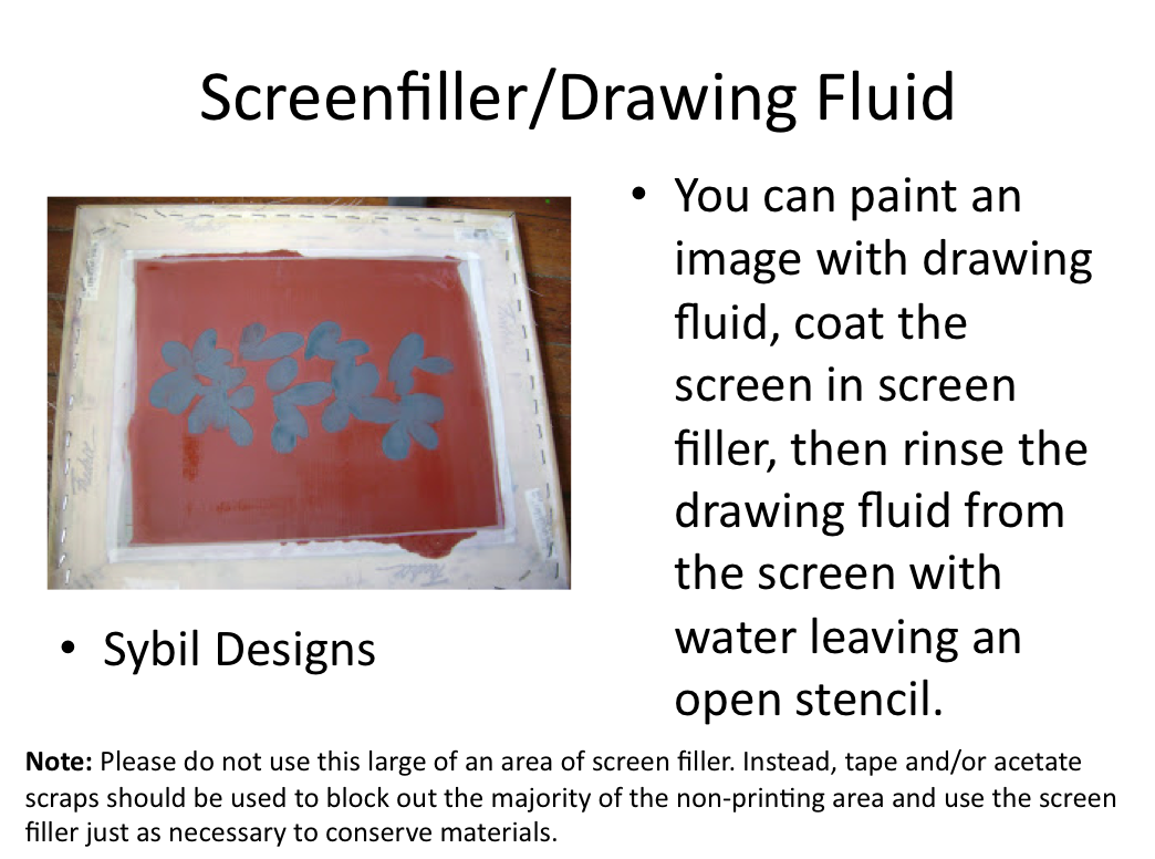 In addition to the use of photoemulsion, you may also use handcut stencils on a clean screen to create screenprinted imagery on paper. Big shapes work best. We also have some drawing fluid and screenfiller that may be used to manually create stencils on the screen which have thinner lines and smaller shapes, as well as a brushwork texture, if desired.