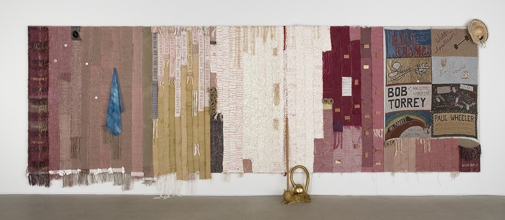 Josh Faught. It Takes a Lifetime to Get Exactly Where You Are, 2012; handwoven sequin trim, handwoven hemp, cedar blocks, cotton, polyester, wool, cochineal dye (from ground cochineal insects), straw hat with lace, toilet paper, paper towels, scrapbooking letters, Jacquard-woven reproduction of a panel from the AIDS Memorial Quilt, silk handkerchief, indigo dye, political pins, disaster blanket, gourd, gold leaf, plaster cat, cedar blocks, and nail polish; 8 x 20 ft. Courtesy of Lisa Cooley, New York.