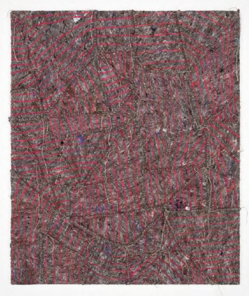 Josh Faught. Untitled, 2012; disaster blanket, nail polish, and linen thread on canvas; 43 x 36 x 2 in. Courtesy of the Artist.