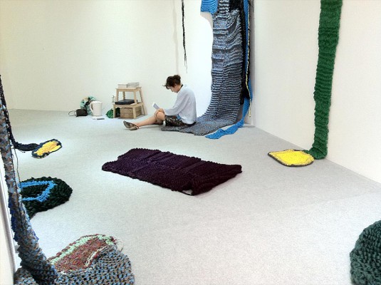 Knit and crocheted trims, laces and yarns; individual pieces installed on site for use, to make a place of congregation and conversation.