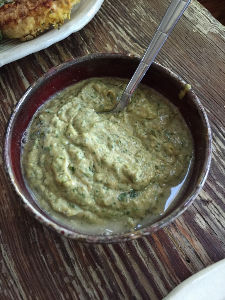 This sauce goes great with chicken strips, like these ones I made when I was pregnant. This time, I dipped my chicken strips in a mix of egg, horseradish mustard, and sriracha then dredged them in gluten-free flour mixed with red & black pepper, salt, and a touch of turmeric. I seared them in a cast iron then put the cast iron in the oven at 350 F for about 15 minutes. I know, I know. The other recipe I linked to above said 325 F for 20-25 minutes. It doesn’t really matter as long as you keep an eye on things. And I was too lazy to look it up, so I made it up as I went along. Just make sure the pan is lightly oiled so the strips don’t stick. I like to turn mine over halfway through, too, to make sure both sides get extra crispy.