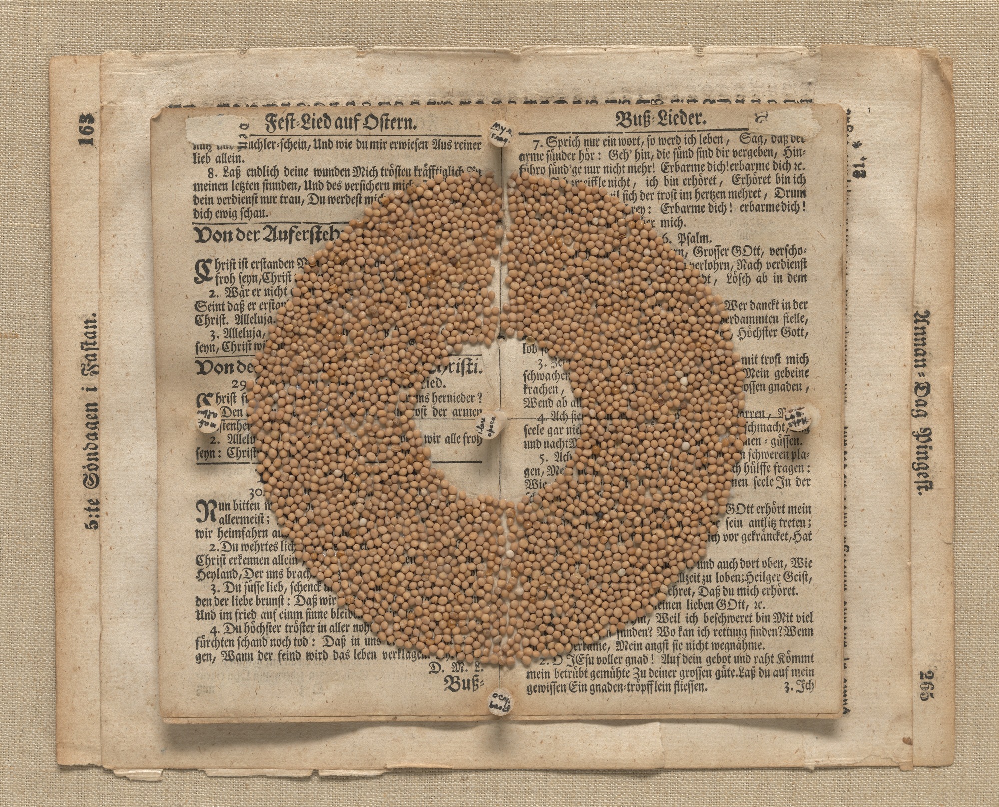Josh Faught. Untitled, 2012; disaster blanket, nail polish, and linen thread on canvas; 43 x 36 x 2 in. Courtesy of the Artist.