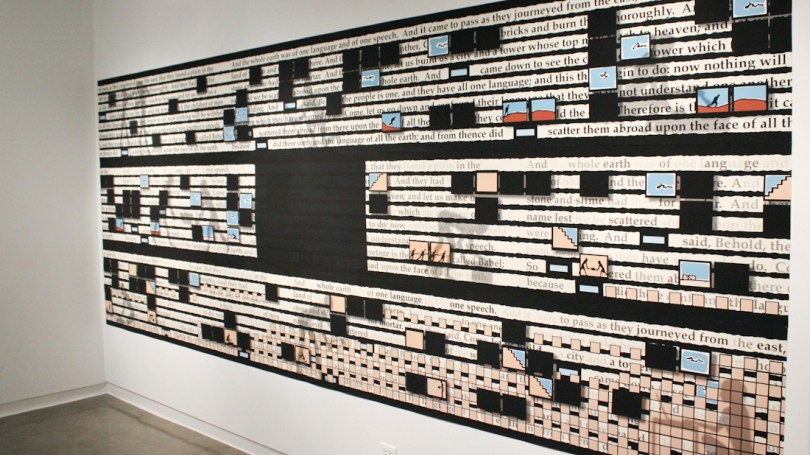 Josh Faught. It Takes a Lifetime to Get Exactly Where You Are, 2012; handwoven sequin trim, handwoven hemp, cedar blocks, cotton, polyester, wool, cochineal dye (from ground cochineal insects), straw hat with lace, toilet paper, paper towels, scrapbooking letters, Jacquard-woven reproduction of a panel from the AIDS Memorial Quilt, silk handkerchief, indigo dye, political pins, disaster blanket, gourd, gold leaf, plaster cat, cedar blocks, and nail polish; 8 x 20 ft. Courtesy of Lisa Cooley, New York.