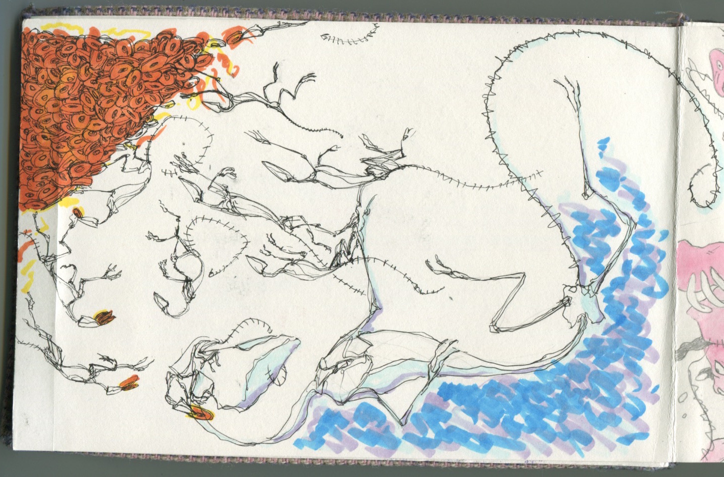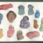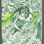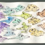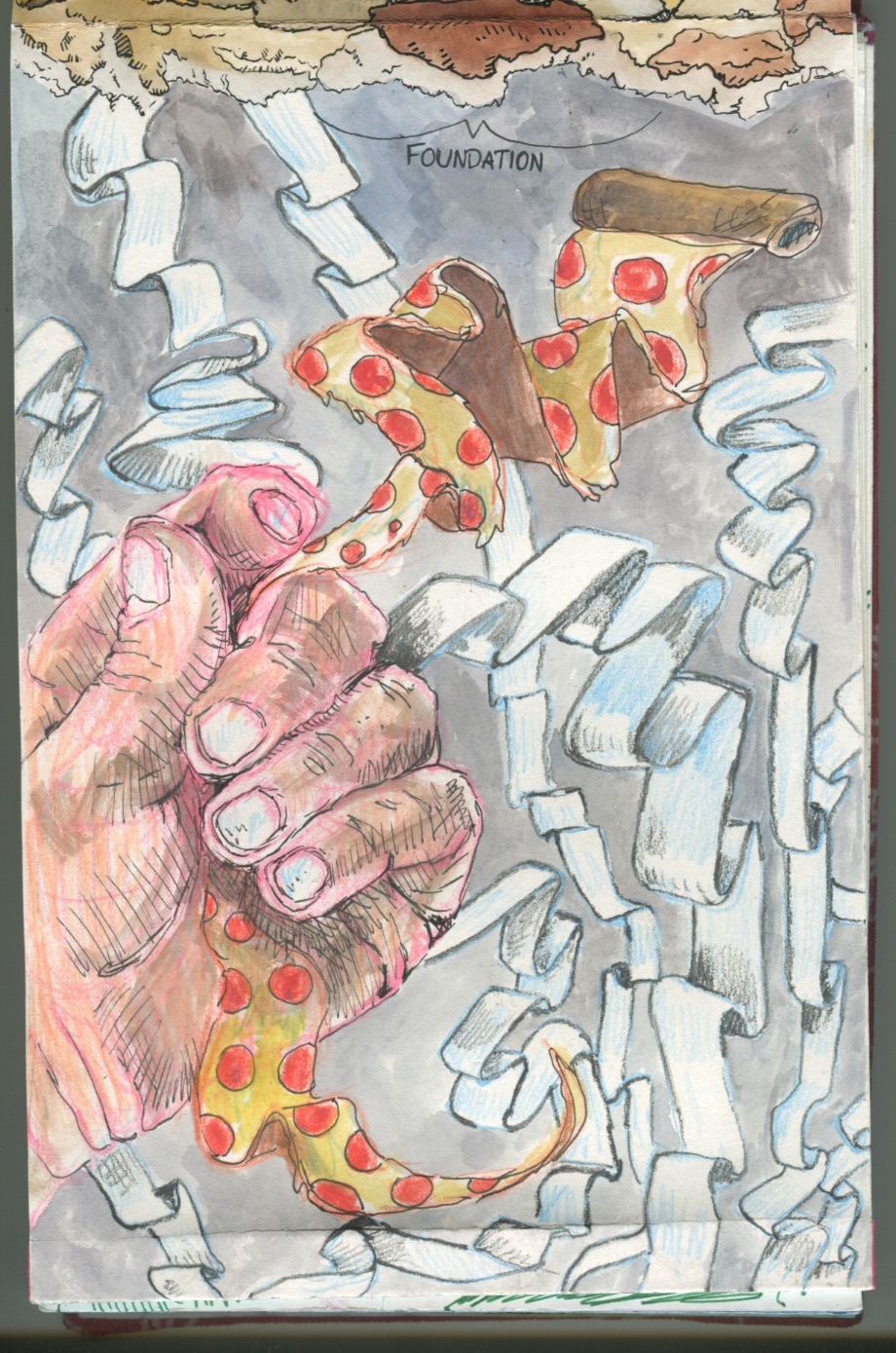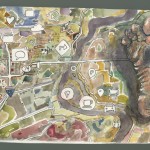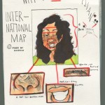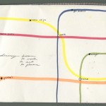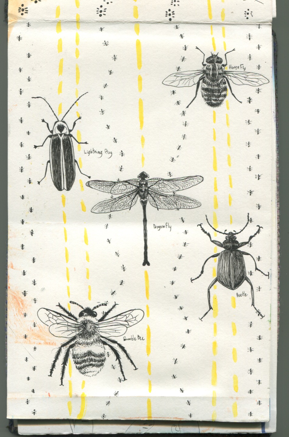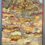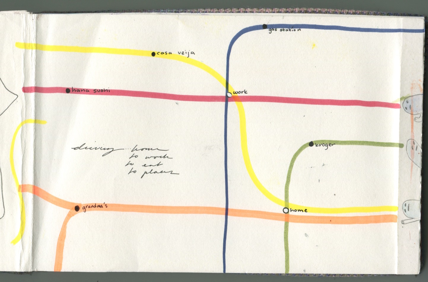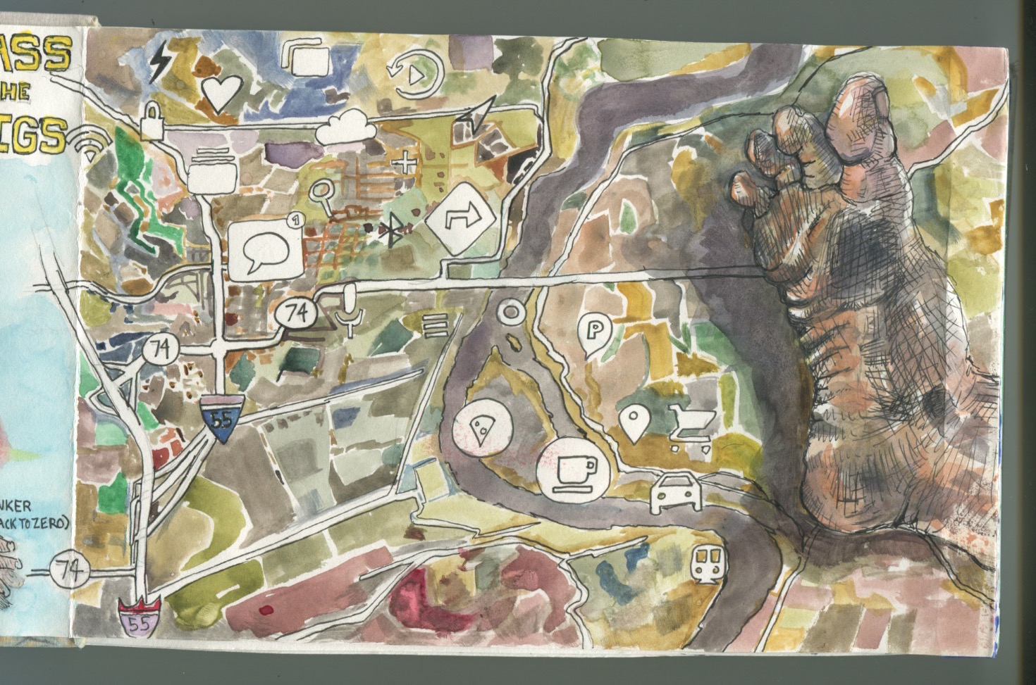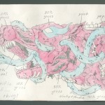 Below are the pages from three collaborative accordion books students worked on at this year’s Gov. School sketchbook class. Each class had a small book to work in, and one larger book that students from both classes helped create. Blake built the books, encasing the covers in repurposed fabric from the local Goodwill. Then students were asked to contribute an illustration on each page that referenced mapping. Each artist was meant to continue a bit of drawing/information onto the next page for the next artist to build onto, á la an Exquisite Corpse. As the end of the workshop loomed, folks had to work fast and then hand them off to unsuspecting classmates. Blake and Hannah contributed as well. See if you can find ours!