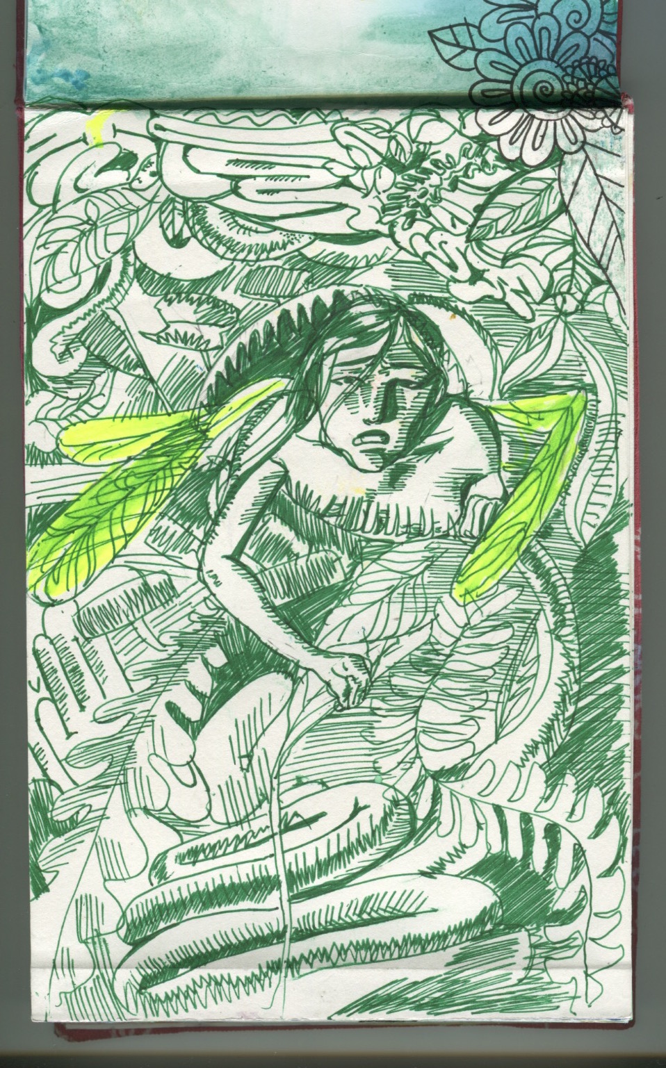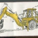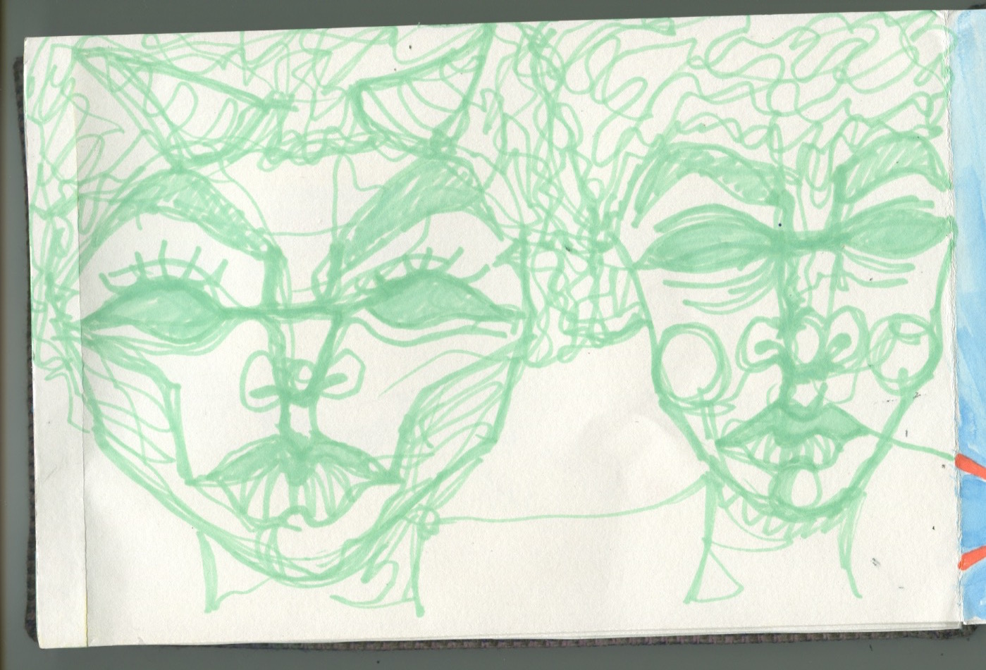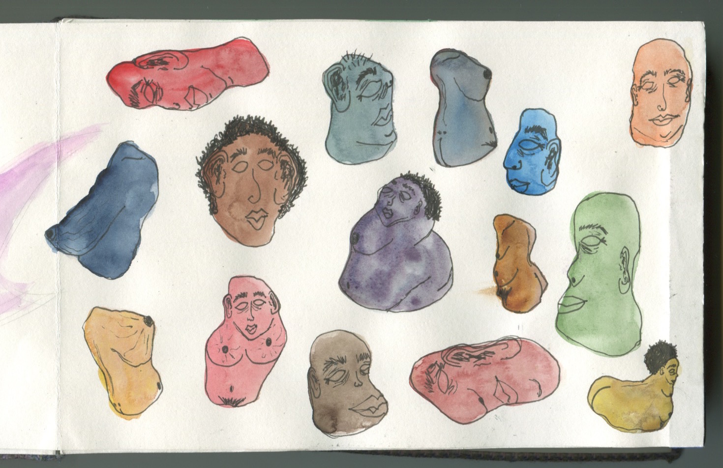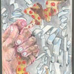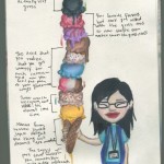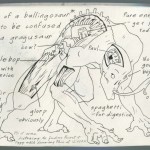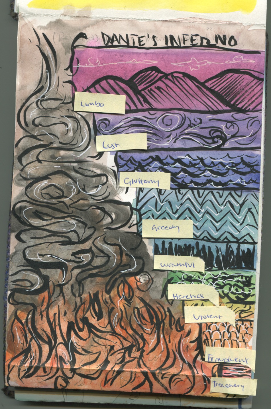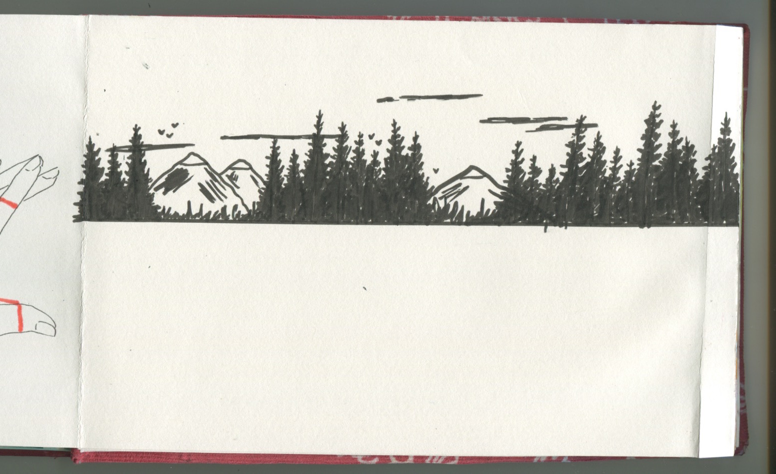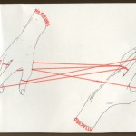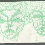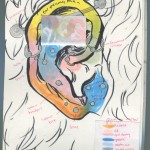 Below are the pages from three collaborative accordion books students worked on at this year’s Gov. School sketchbook class. Each class had a small book to work in, and one larger book that students from both classes helped create. Blake built the books, encasing the covers in repurposed fabric from the local Goodwill. Then students were asked to contribute an illustration on each page that referenced mapping. Each artist was meant to continue a bit of drawing/information onto the next page for the next artist to build onto, á la an Exquisite Corpse. As the end of the workshop loomed, folks had to work fast and then hand them off to unsuspecting classmates. Blake and Hannah contributed as well. See if you can find ours!